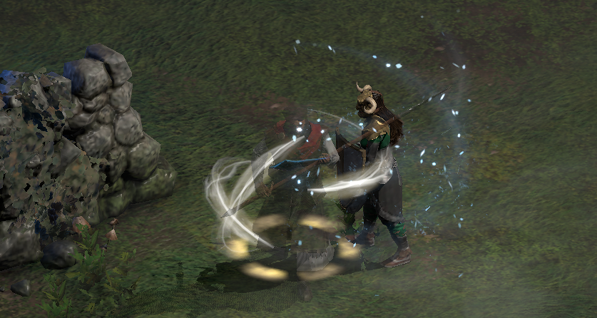 투명 효과를 없애는 대신에 아래처럼 사이클론 아머 (회오리 갑옷) 효과를 주어 보았습니다. 일단 용병이 눈에 잘 띄고, 페이드가 원소 저항 증가, 사이클론 아머가 원소 피해 감소 효과이니 뭔가 느낌도 통하는 것 같습니다!
